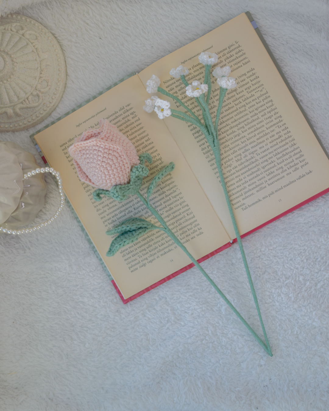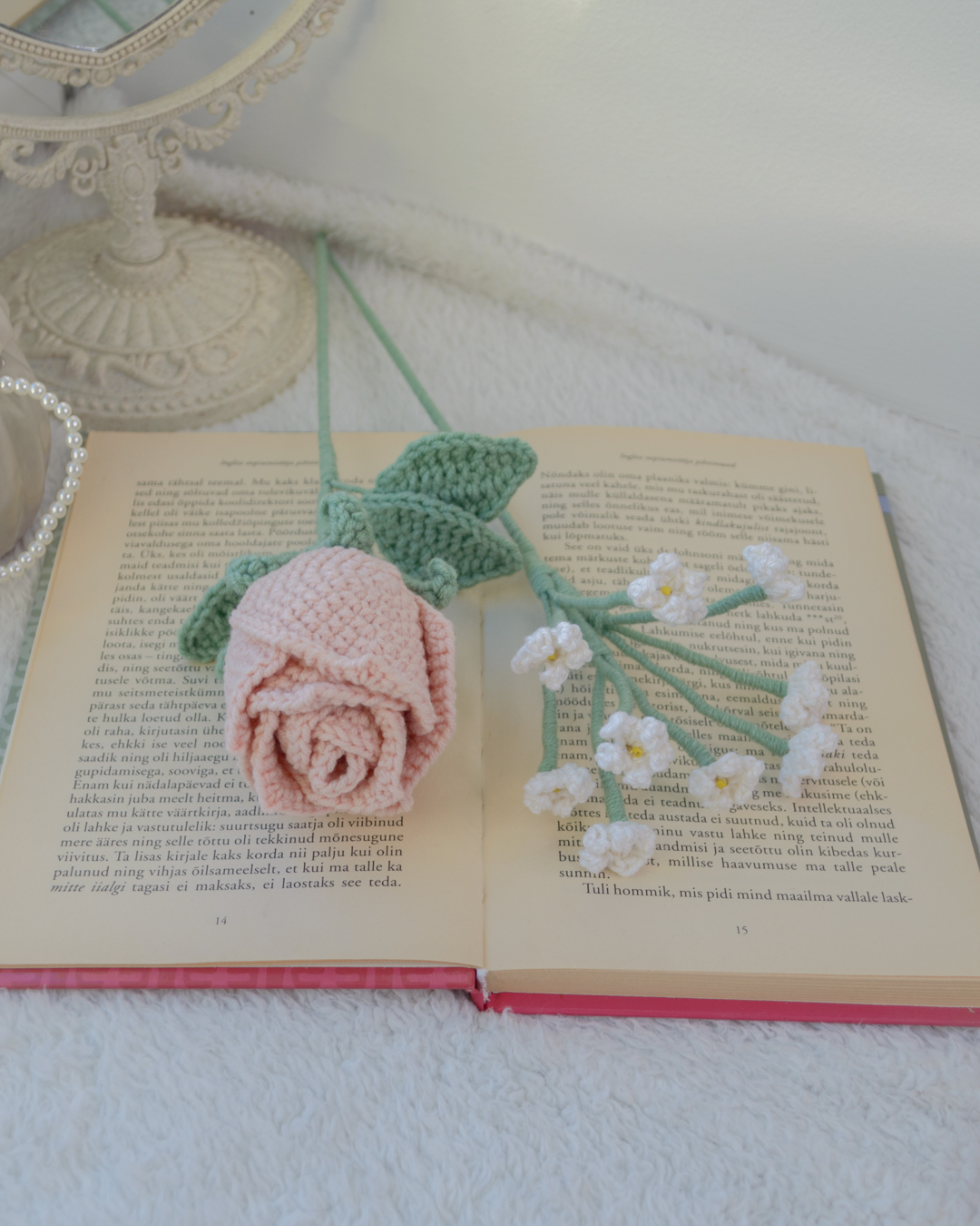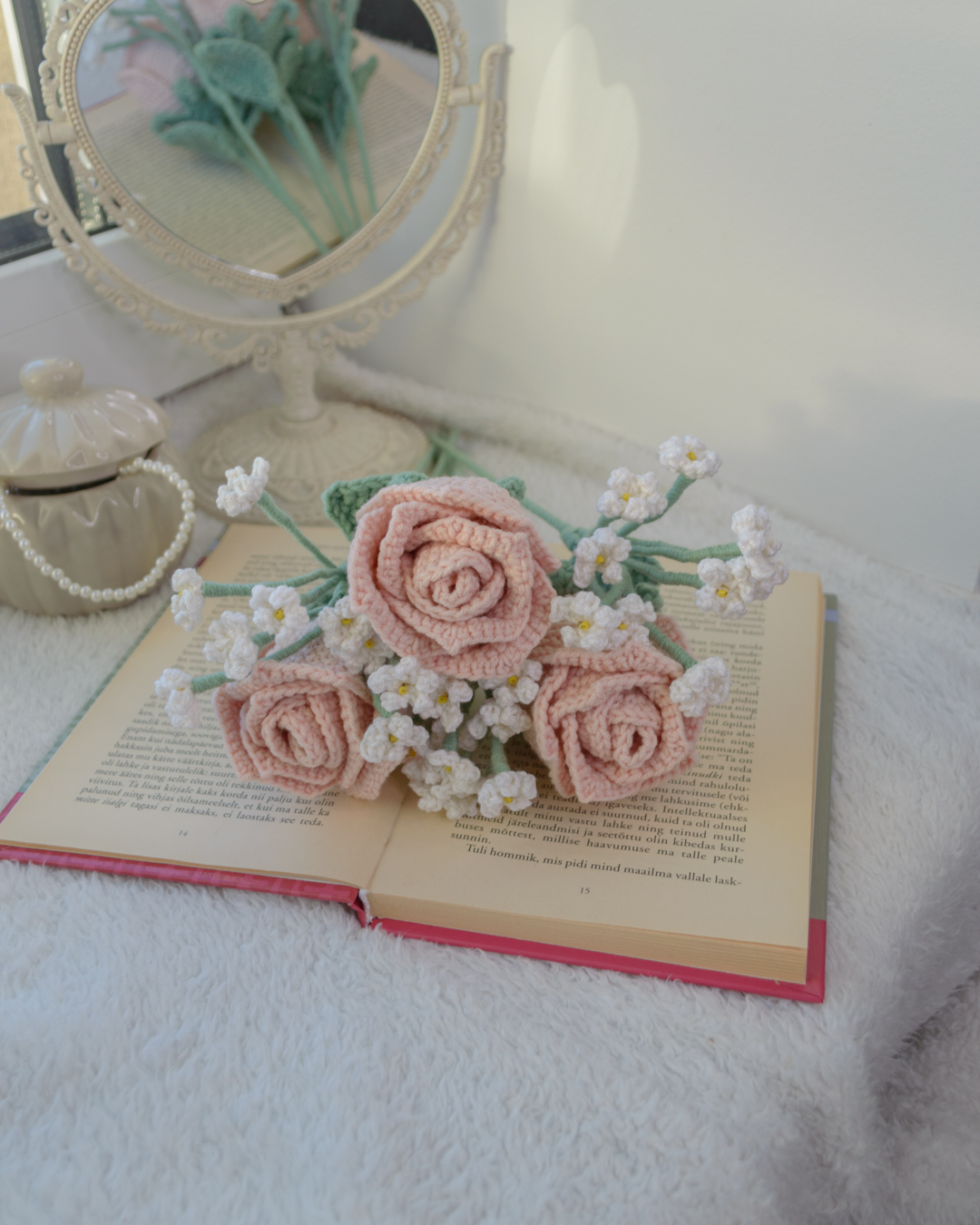 Kimbus 6 käsitööna heegeldatud lille: 3 punast roosi ja 3 oksa kipslilli (igal oksal 9 õit)