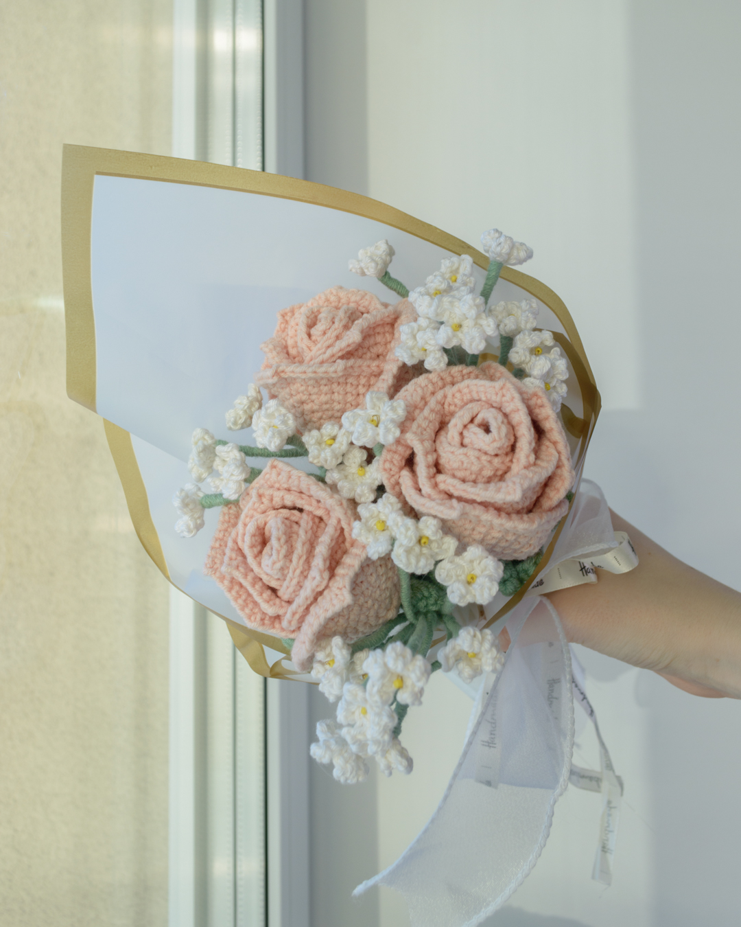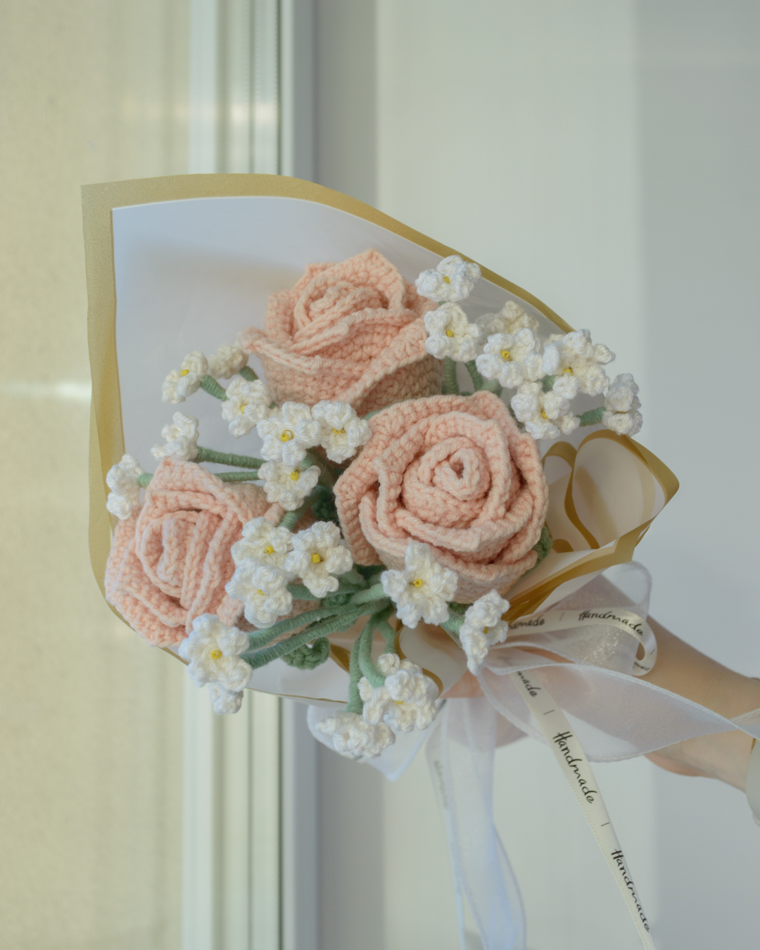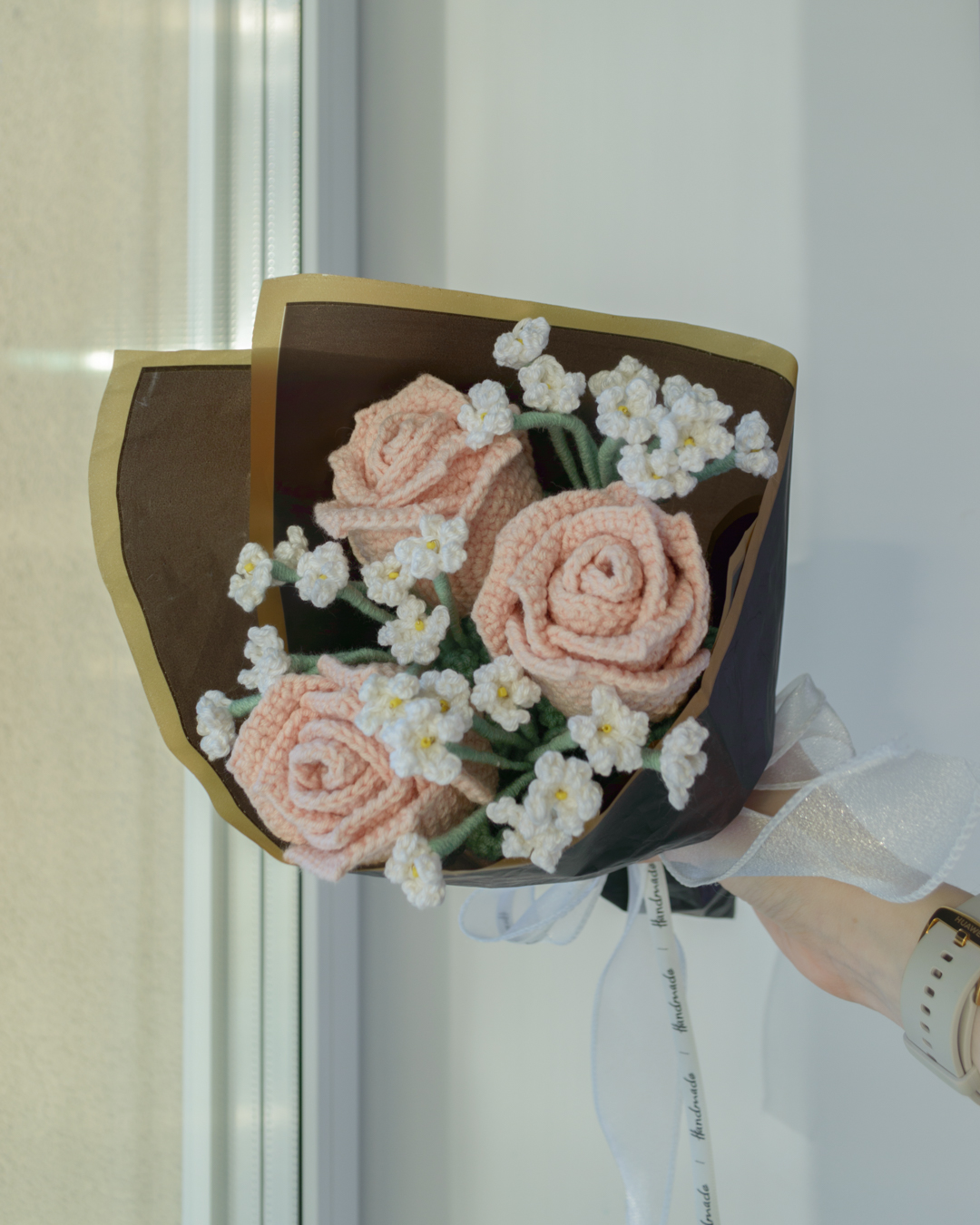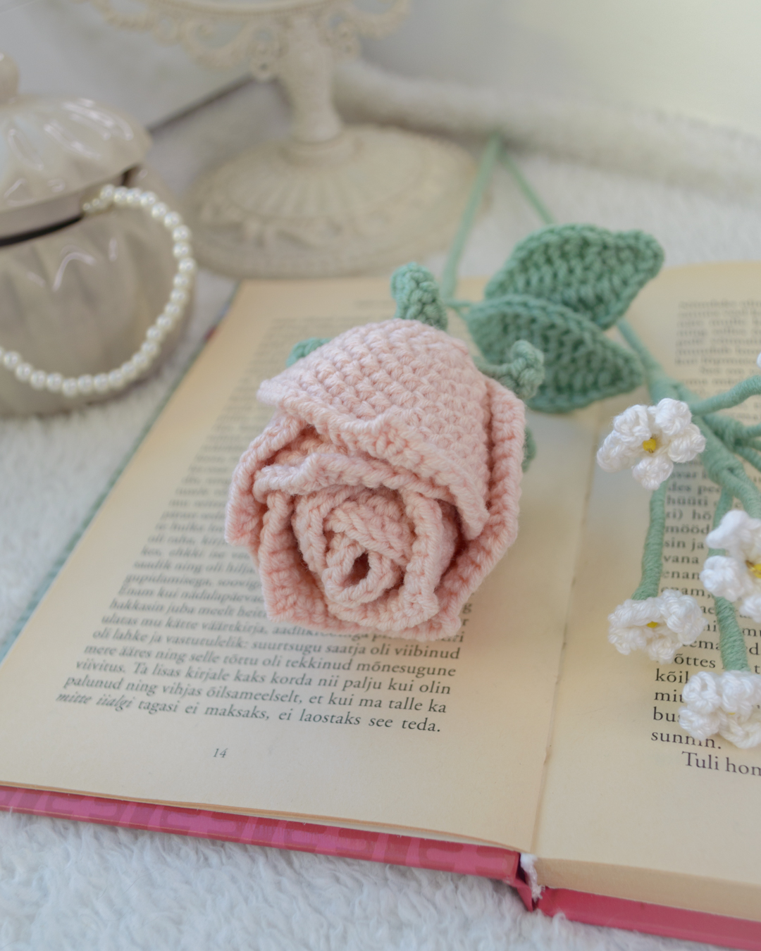 Kimbus 6 käsitööna heegeldatud lille: 3 punast roosi ja 3 oksa kipslilli (igal oksal 9 õit)