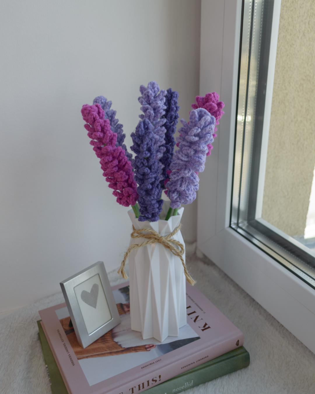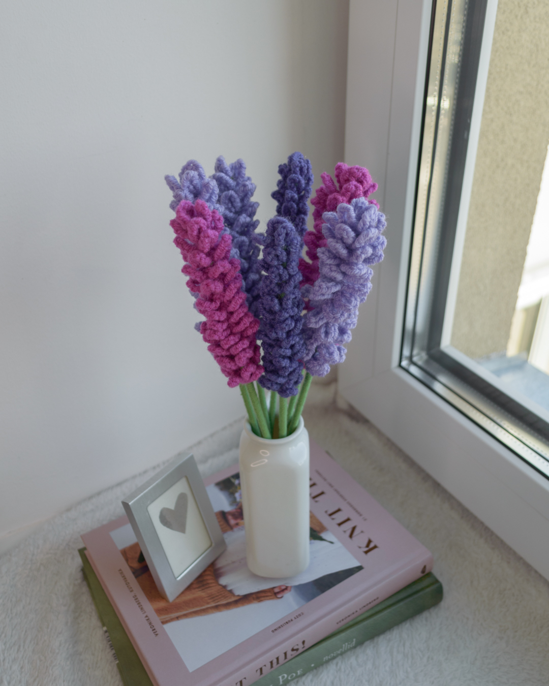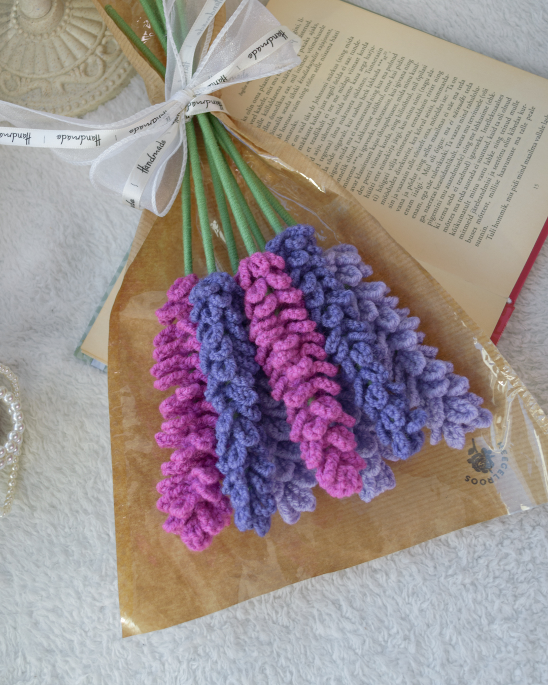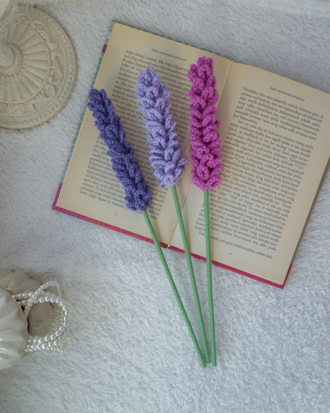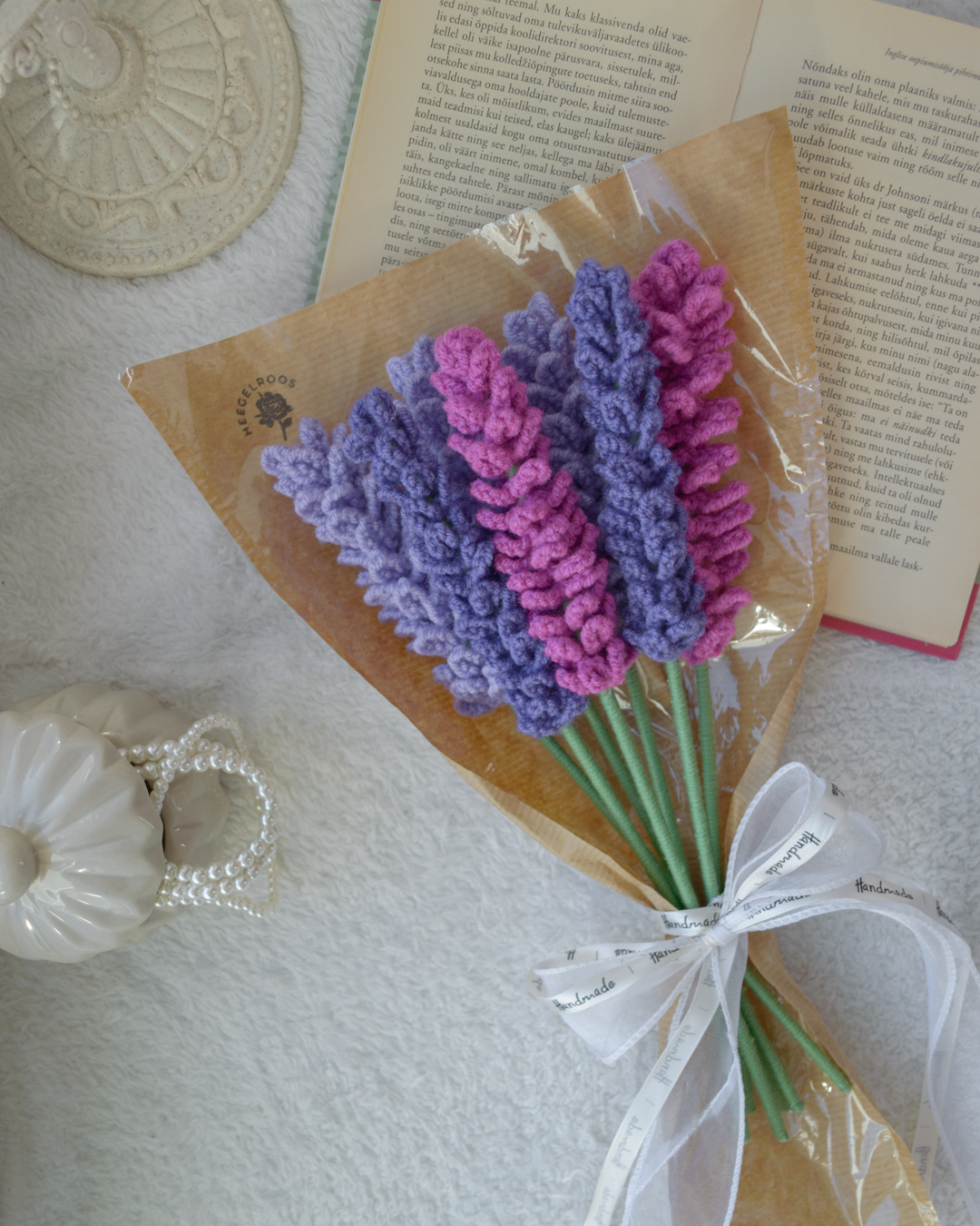 Kimbus 7 käsitööna heegeldatud oksa: 2 lillat, 3 helelillat ja 2 roosakaslillat lavendlit Ühe pikkus ~30cm