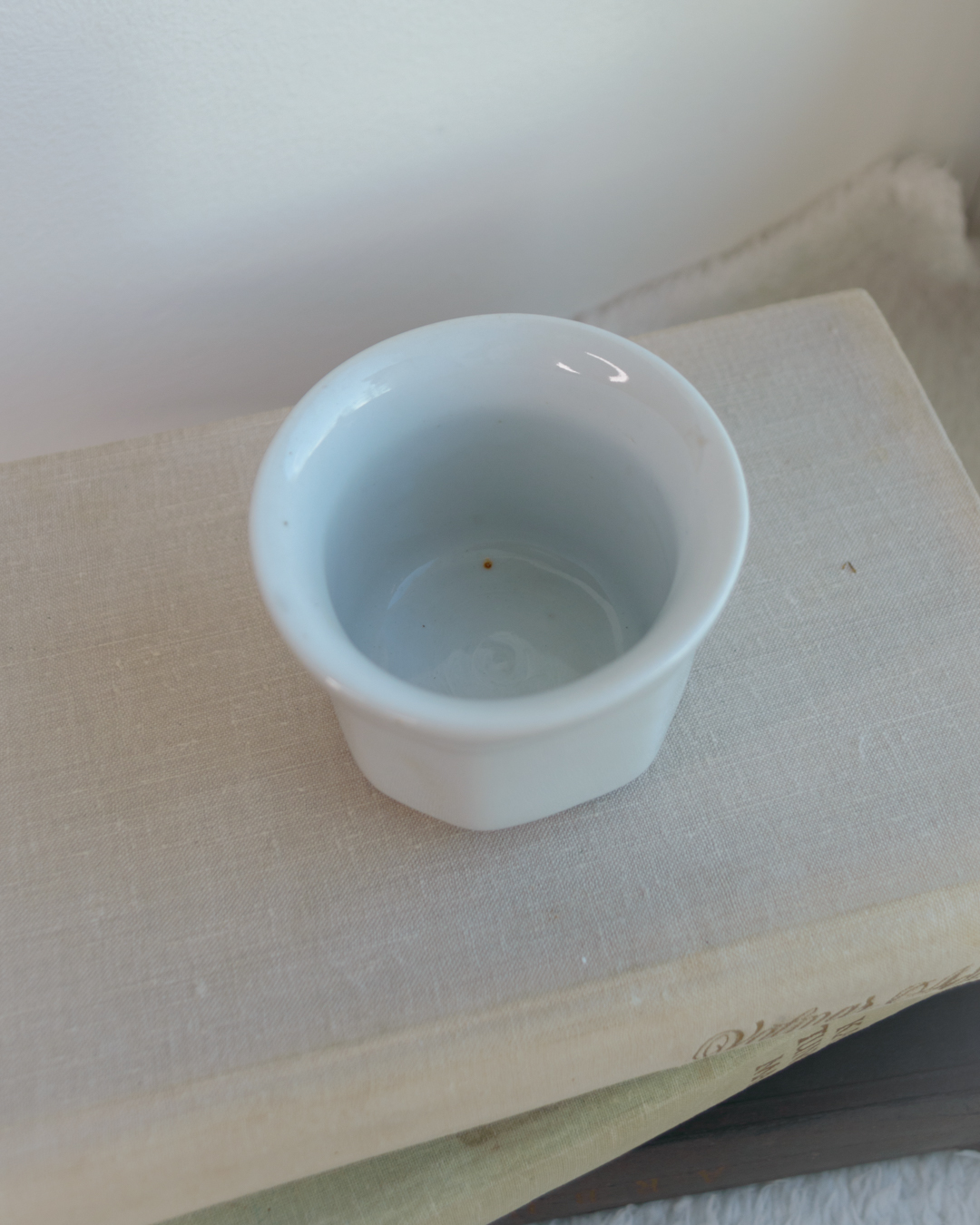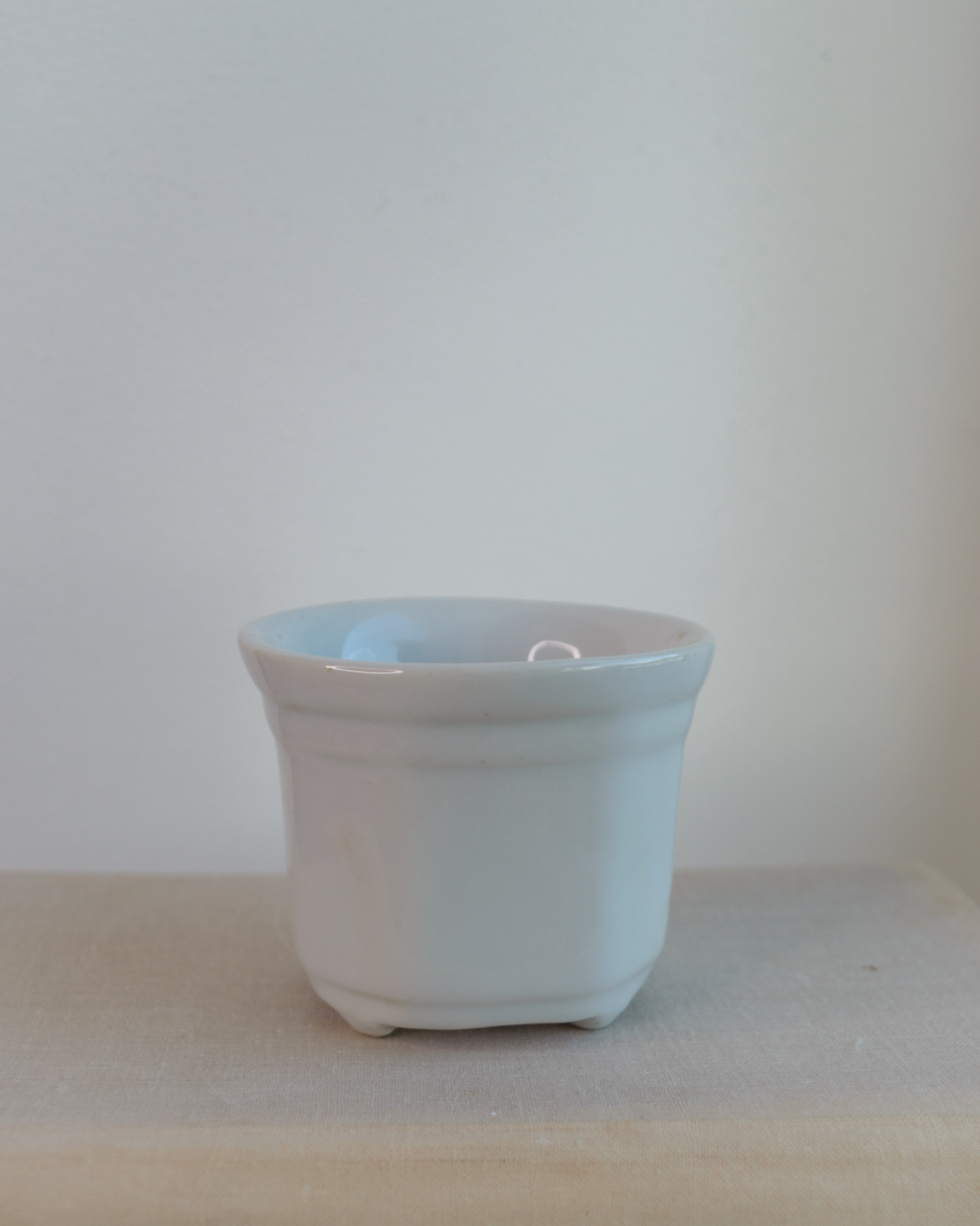 Pildil olev valge pott 6×7,5cm. Ostetud taaskasutuspoest.