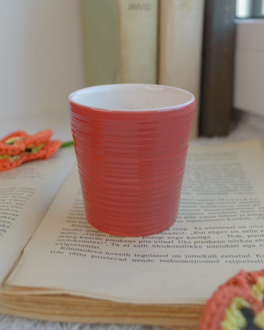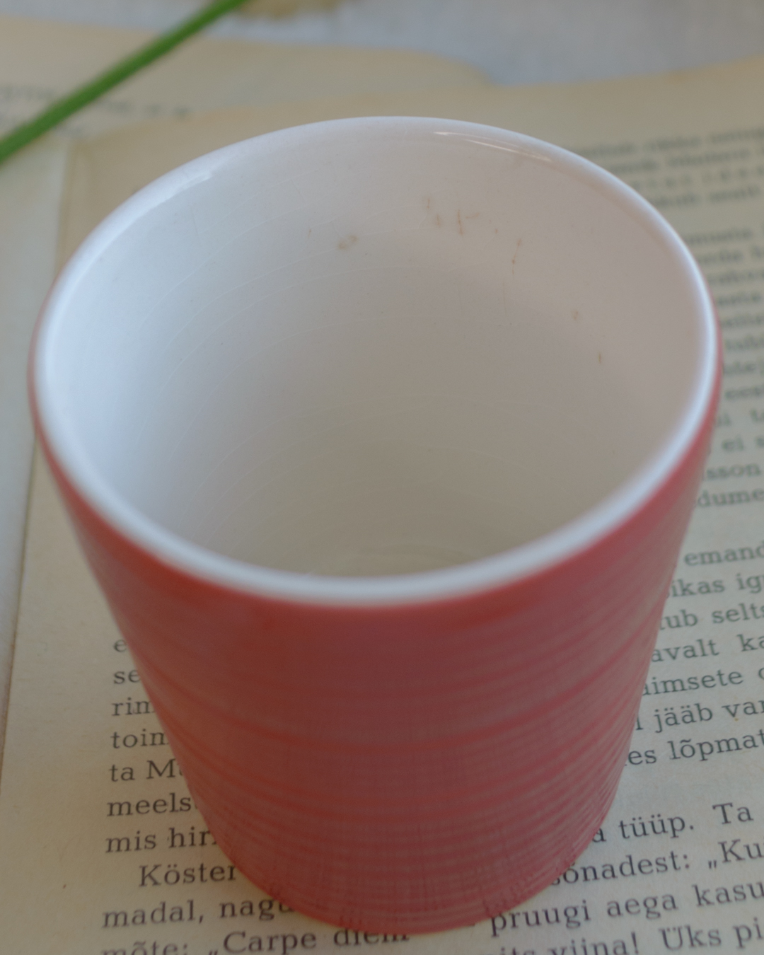Pildil olev kollakas pott 6,5x6cm. Ostetud taaskasutuspoest ja potil esineb defekte, mis on piltidel väljatoodud (seespoolsed praod).