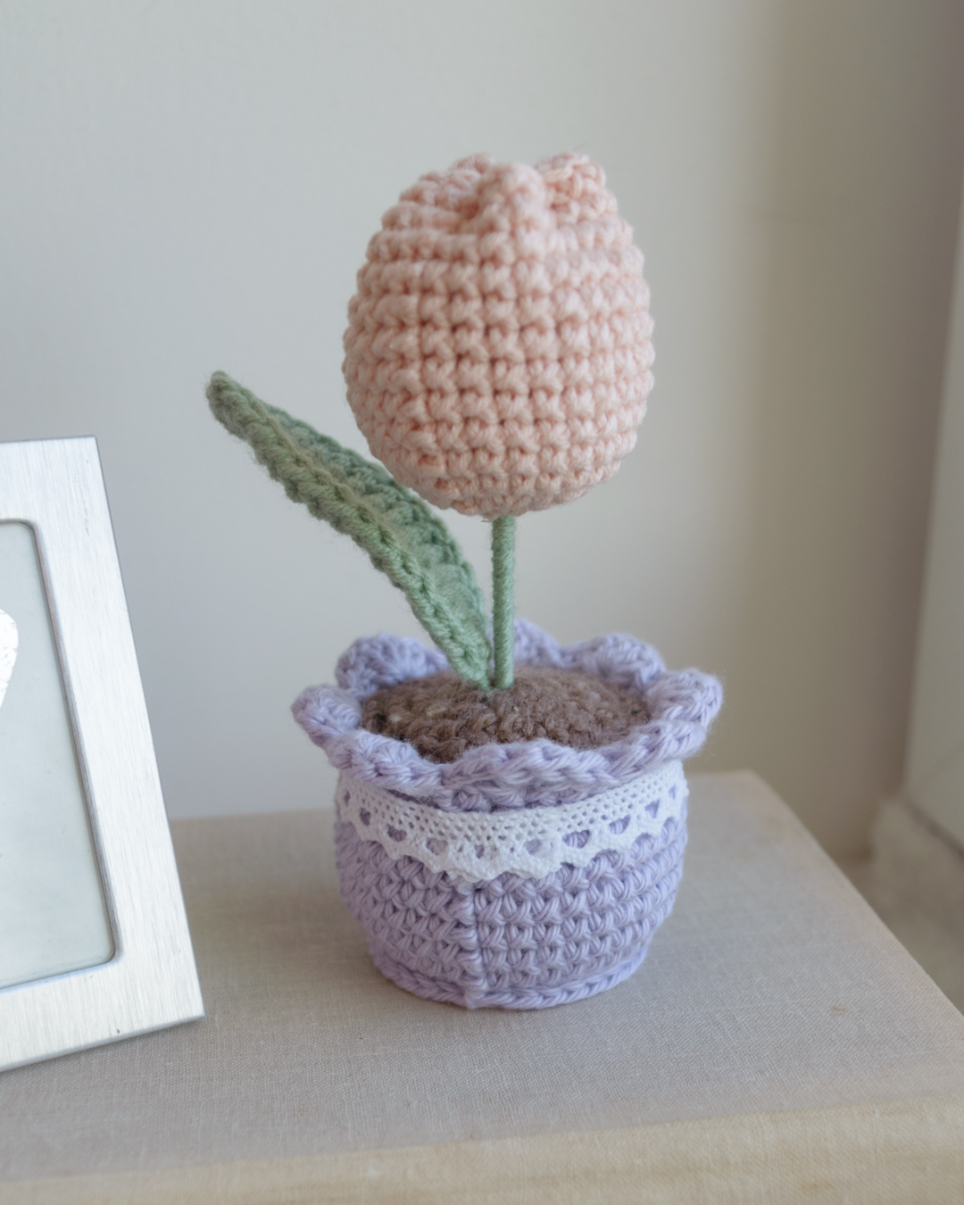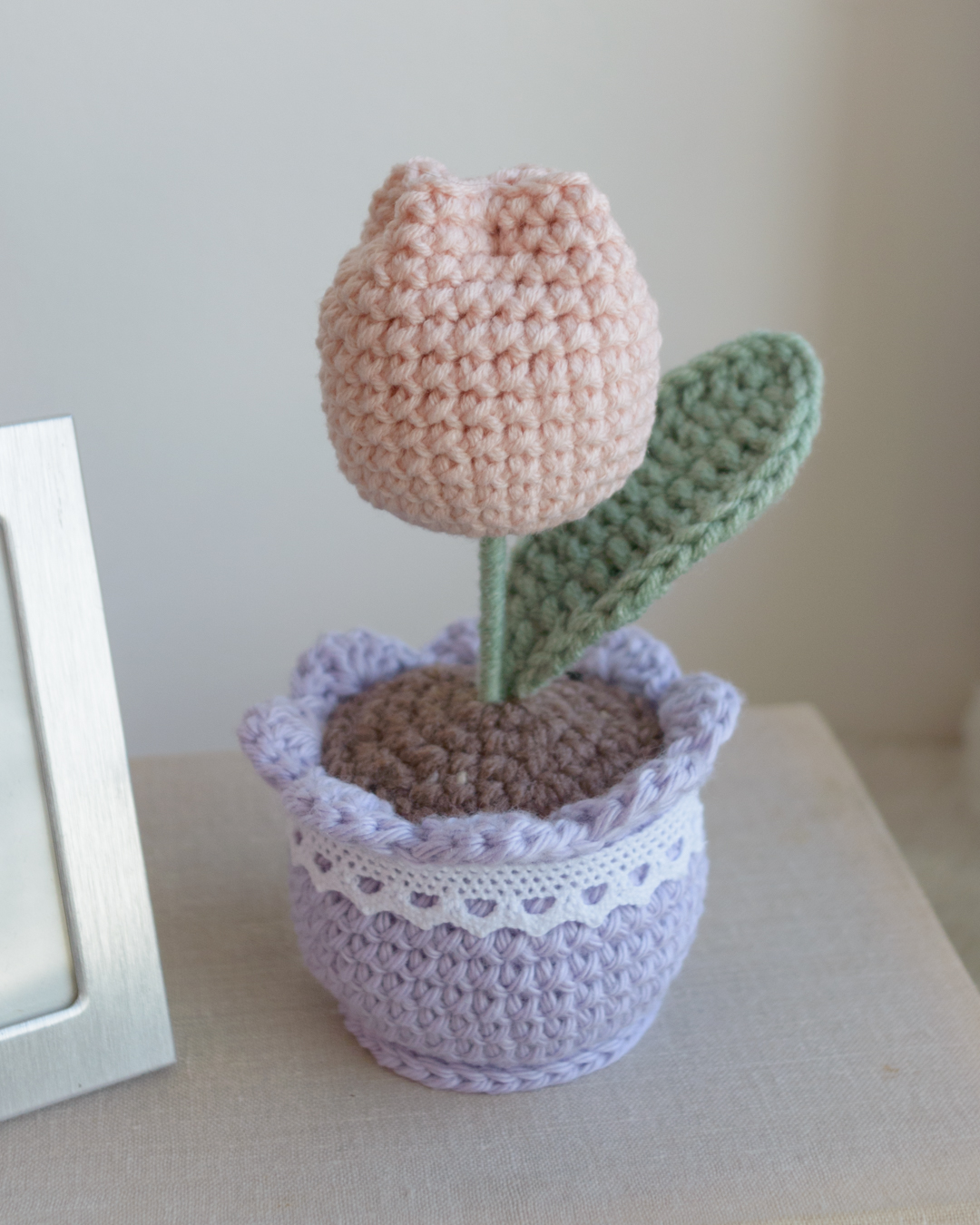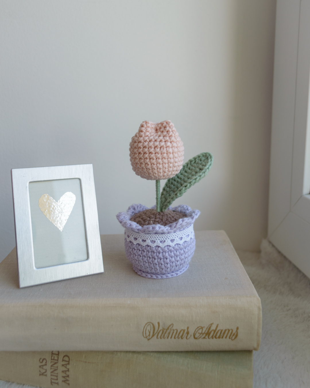 Käsitööna heegeldatud tulp potis