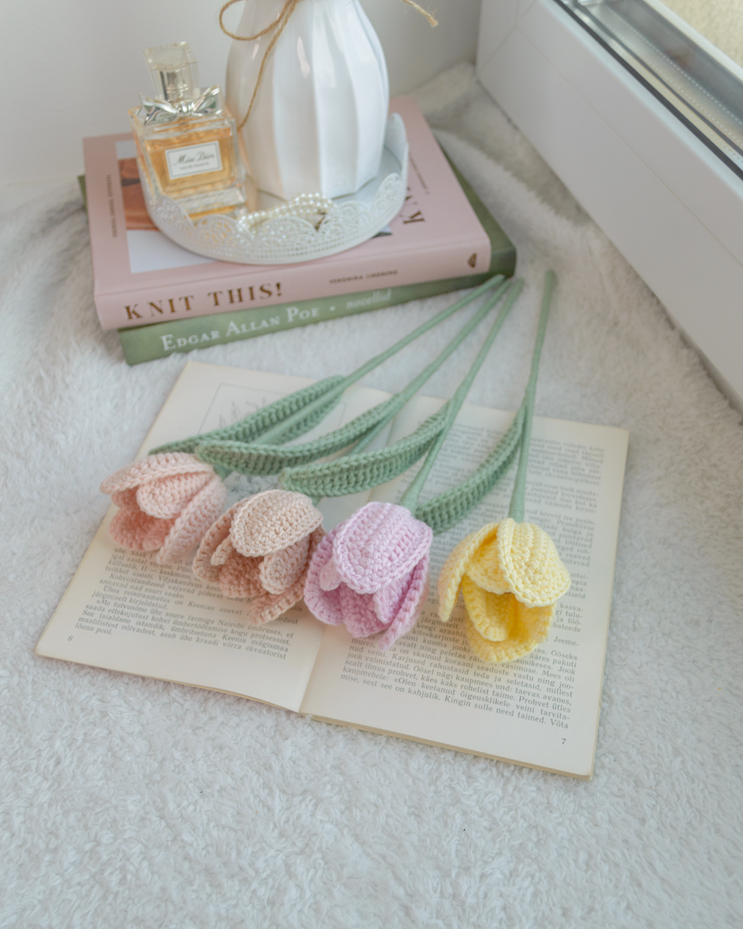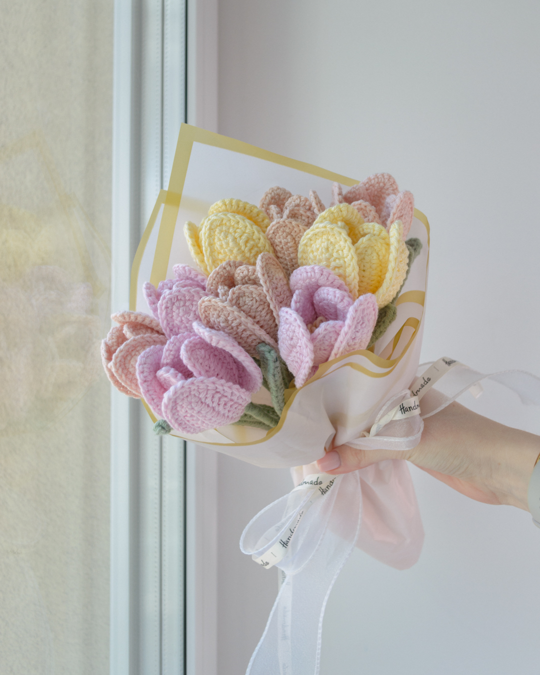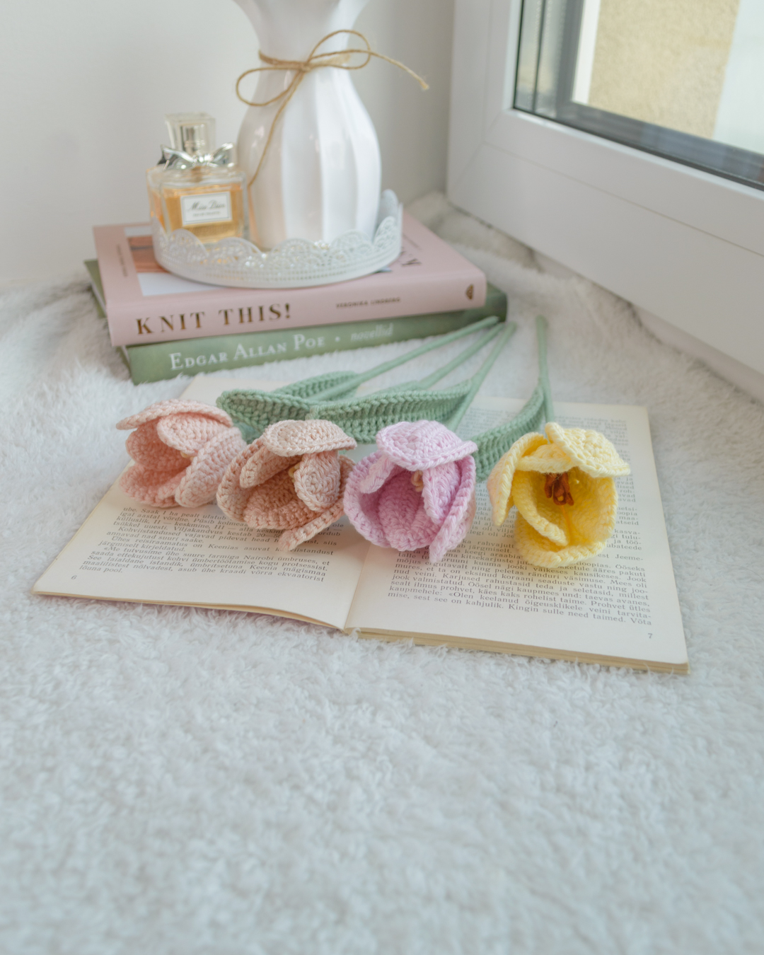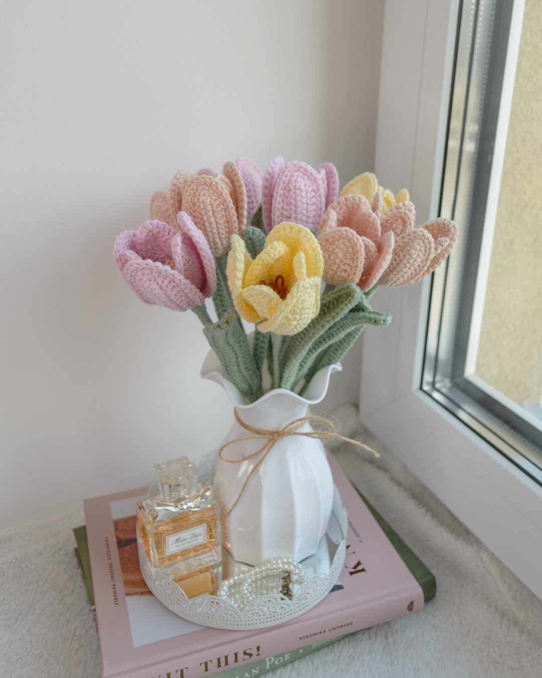Käsitööna heegeldatud roosades ja kollastes toonides tulbikimp
