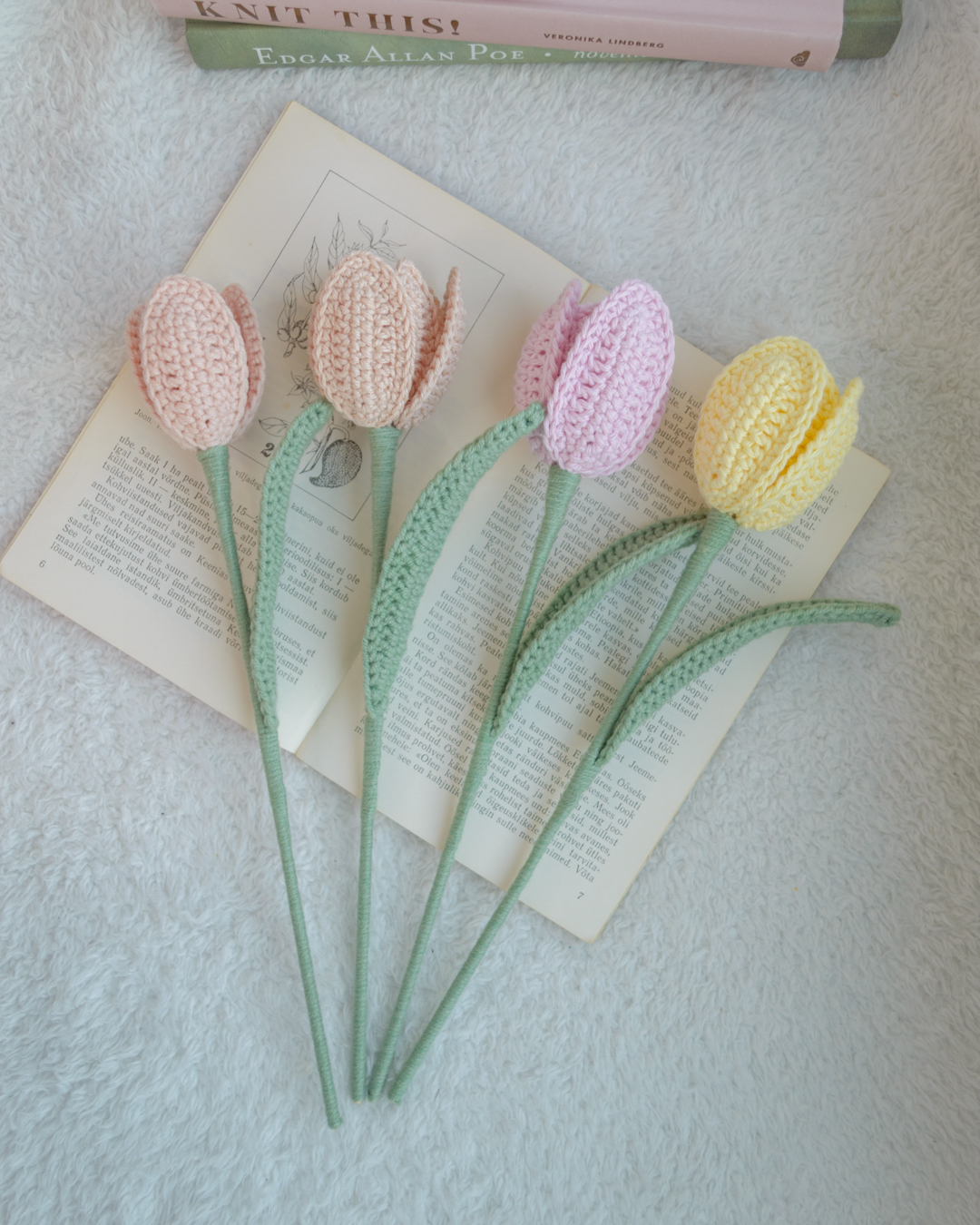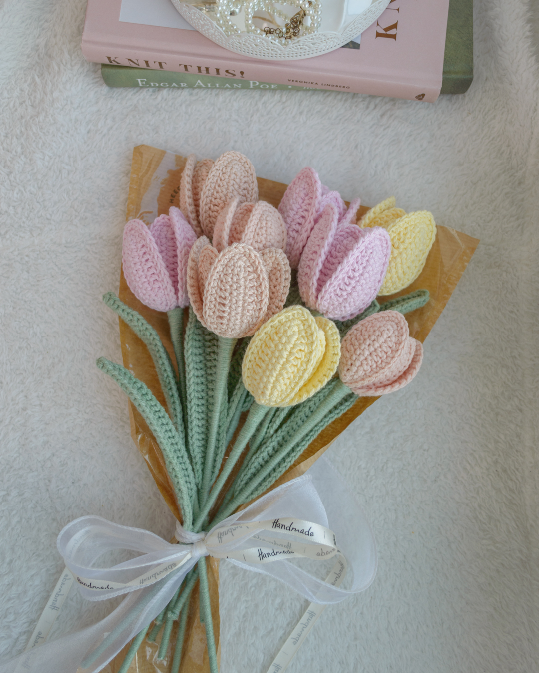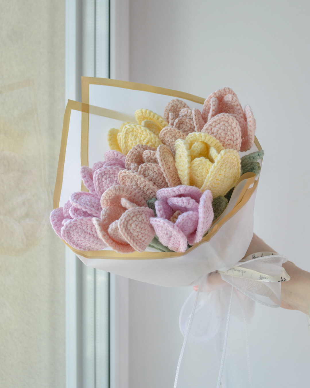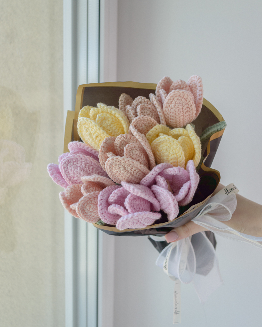 Käsitööna heegeldatud roosades ja kollastes toonides tulbikimp